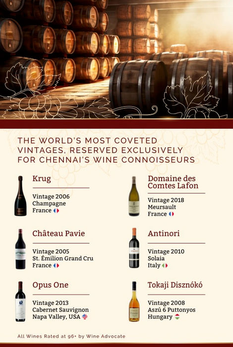 Each spread highlighted a legendary vintage—Krug 2006, Château Pavie 2005, Opus One 2013, Domaine des Comtes Lafon 2018, Antinori Solaia 2010, and Tokaji Disznókó 2008—with meticulously curated visuals, regional storytelling, and tasting palettes.
